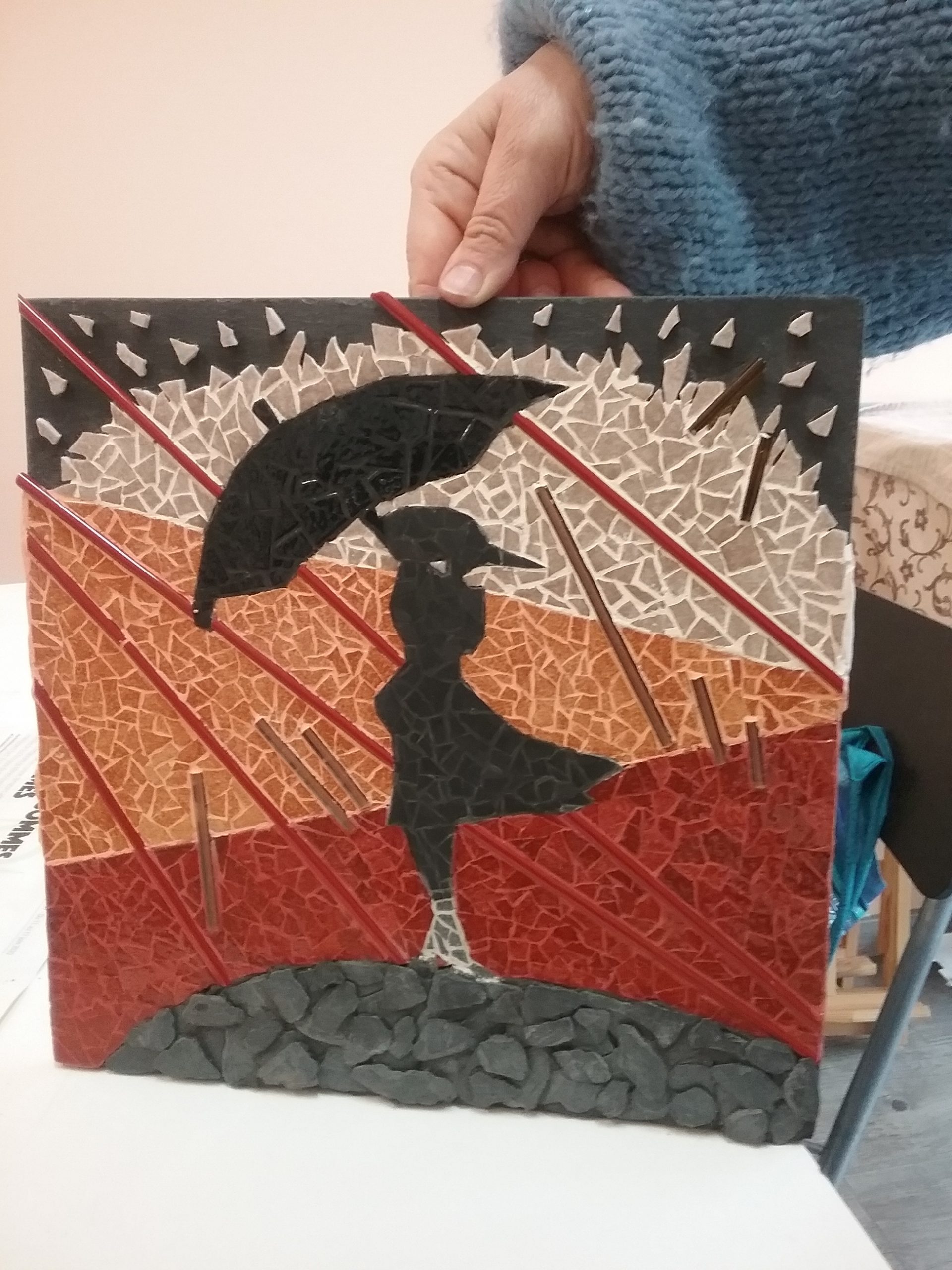 J‘ai pu constater tout le long de mon parcours artistique, le plus grand bien que pouvait apporter cette activité mosaïque, tant pour des personnes vivant dans leur vie des moments de situations difficiles ( période de vie difficile à vivre, stress, perte de confiance en soi, maladie, handicap, solitude, dépression ) que pour des personnes seulement désireuses d’apprendre la mosaïque. »